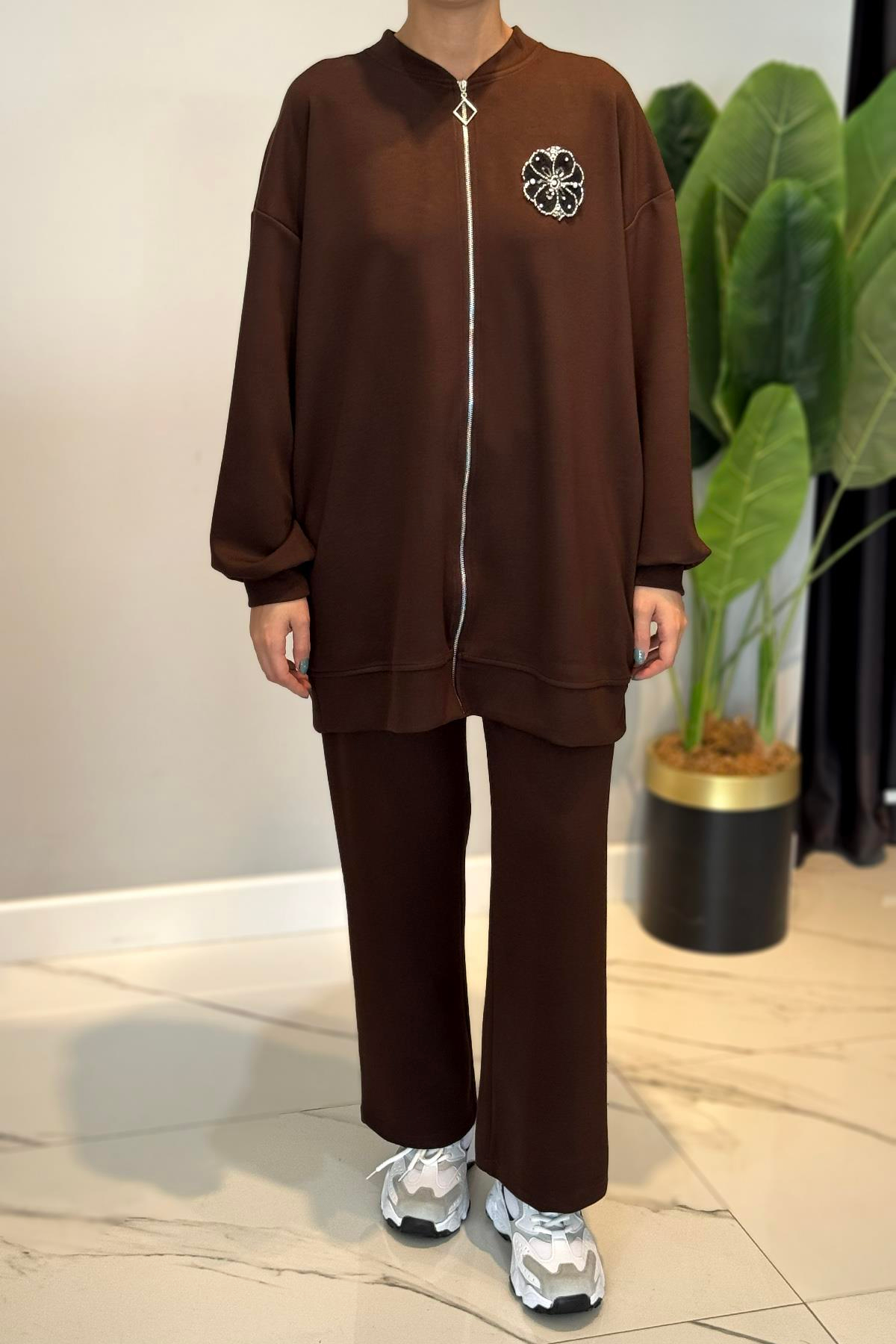 Fitilli Taş Detaylı Fermuarlı Takım 120299 Kahverengi Tunik ve pantolon olmak üzere 2 parça şeklinde takımdır. Kumaş Bilgisi: %50pamuk %47polyester %3elastik Hem spor hem şık kombinlerinizde kullanabileceğiniz bir modeldir. Manken üzerindeki beden 36 bedendir. Manken boy:170cm Kilo:60kg Bedenler: 36-38-40-42-44-46şeklindedir. Kullanım sırasında, çanta, aksesuar veya takılara dikkat edilmelidir. Hassas üründür. YIKAMA TALİMATLARI: -Ilık suda ters çevrilerek yıkanmalıdır. -Tek başına yıkanmalıdır. -Renk verebilir. Kaloriferde vb. direk güneşte kurutmayınız.