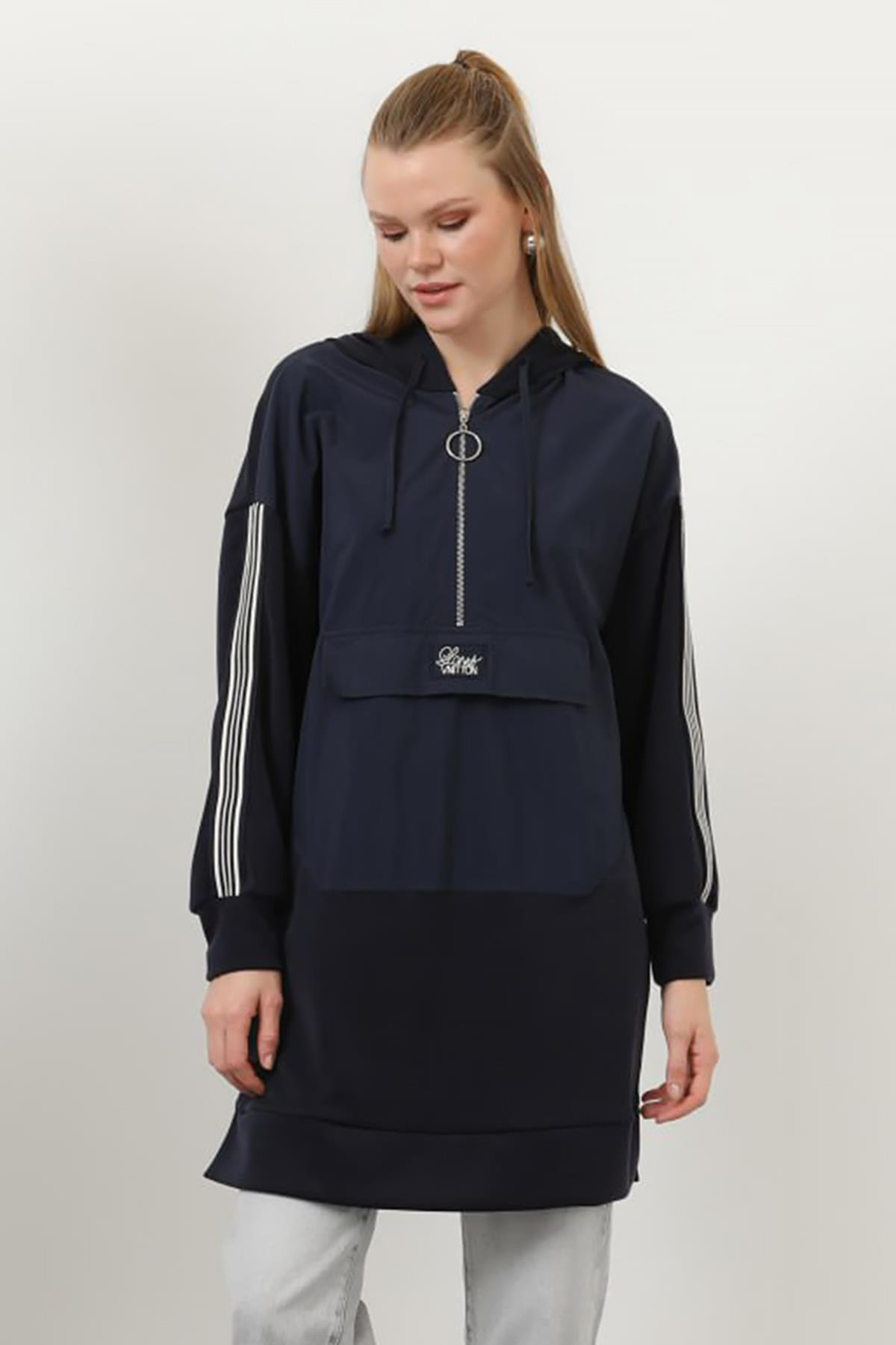 Kapüşonlu Fermuar Detay Paraşüt Cep Modal Sweat Tunik 10610 Lacivert Tek parçadır. Hem şık hem spor kombinleyebileceğiniz bir ürün. Bedenler: 1(S-M) , 2(L-XL) şeklindedir. 1Beden= Göğüs:110cm Bel: 110cm Basen: 114cm Boy:82cm civarıdır. 2Beden= Göğüs:112cm Bel: 112cm Basen: 116cm Boy:84cm civarıdır. Kumaş Bilgisi=%48Polyester %46Modal %6Spandex Kullanım sırasında, çanta, aksesuar veya takılara dikkat edilmelidir. Hassas üründür. YIKAMA TALİMATLARI: -Ilık suda ters çevrilerek yıkanmalıdır. -Tek başına yıkanmalıdır. -Renk verebilir. Kaloriferde vb. direk güneşte kurutmayınız.