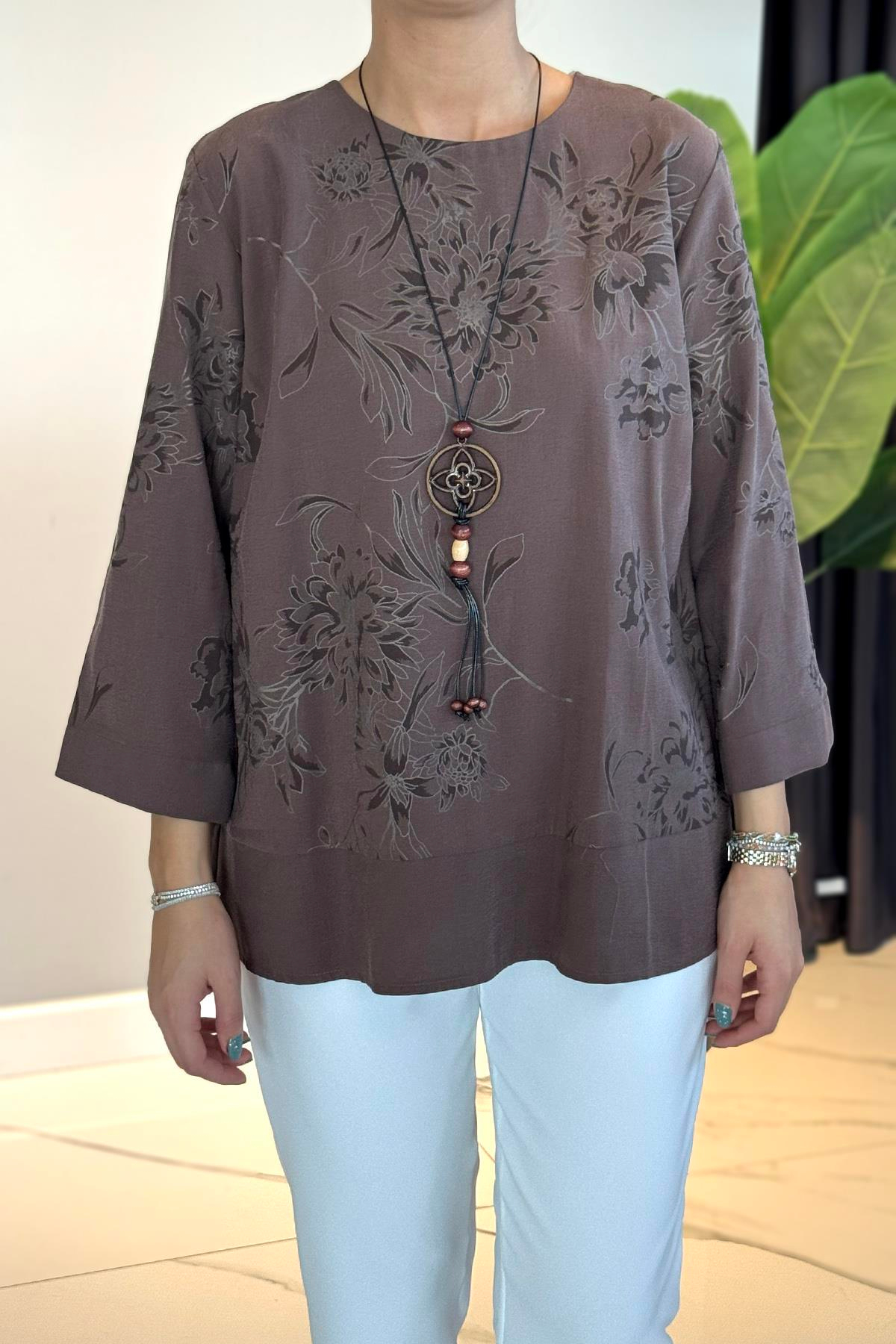 Kolye Detaylı Desenli Bluz 31532 Kahve TEK PARÇADIR. Kolye dahildir. Kumaş Bilgisi: %100 polyester şeklindedir. Bluz boy: 68cm civarındadır. Hem spor hem şık kombinlerinizde kullanabileceğiniz bir modeldir. Manken üzerindeki beden 44 bedendir. Manken boy:170cm Kilo:60 Bedenler: 36-38-40-42-44-46 şeklindedir. Kullanım sırasında, çanta, aksesuar veya takılara dikkat edilmelidir. Hassas üründür. YIKAMA TALİMATLARI: -Ilık suda ters çevrilerek yıkanmalıdır. -Tek başına yıkanmalıdır. -Renk verebilir. Kaloriferde vb. direk güneşte kurutmayınız.