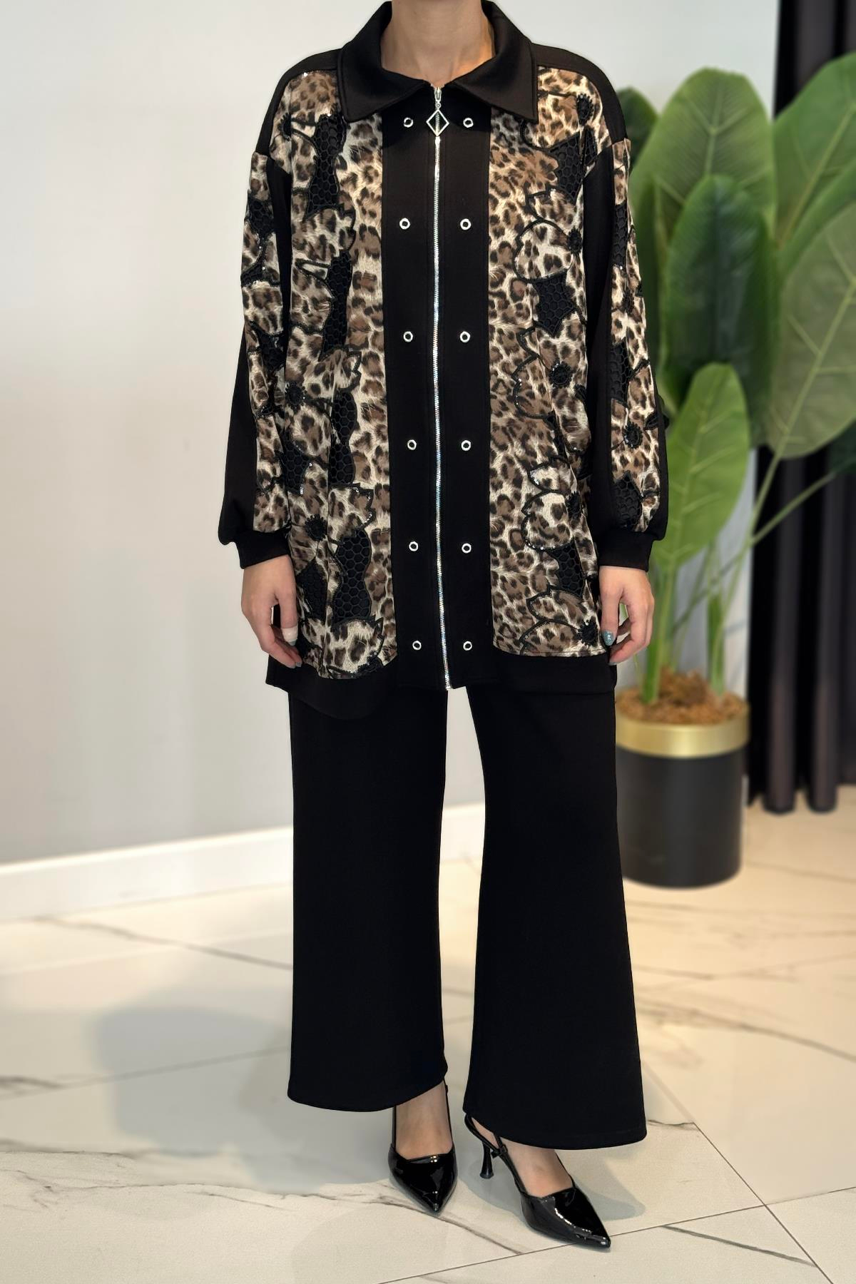 Leoparlı Modal Takım 120297 Siyah Tunik ve pantolon olmak üzere 2 parça şeklinde takımdır. Leopar desenlidir. Kumaş Bilgisi: %50 pamuk %47 polyester %3 elastik Hem spor hem şık kombinlerinizde kullanabileceğiniz bir modeldir. Manken üzerindeki beden 38 bedendir. Manken Boy:170cm Kilo:60 Bedenler:36-38-40-42-44-46 şeklindedir. Kullanım sırasında, çanta, aksesuar veya takılara dikkat edilmelidir. Hassas üründür. YIKAMA TALİMATLARI: -Ilık suda ters çevrilerek yıkanmalıdır. -Tek başına yıkanmalıdır. -Renk verebilir. Kaloriferde vb. direk güneşte kurutmayınız.