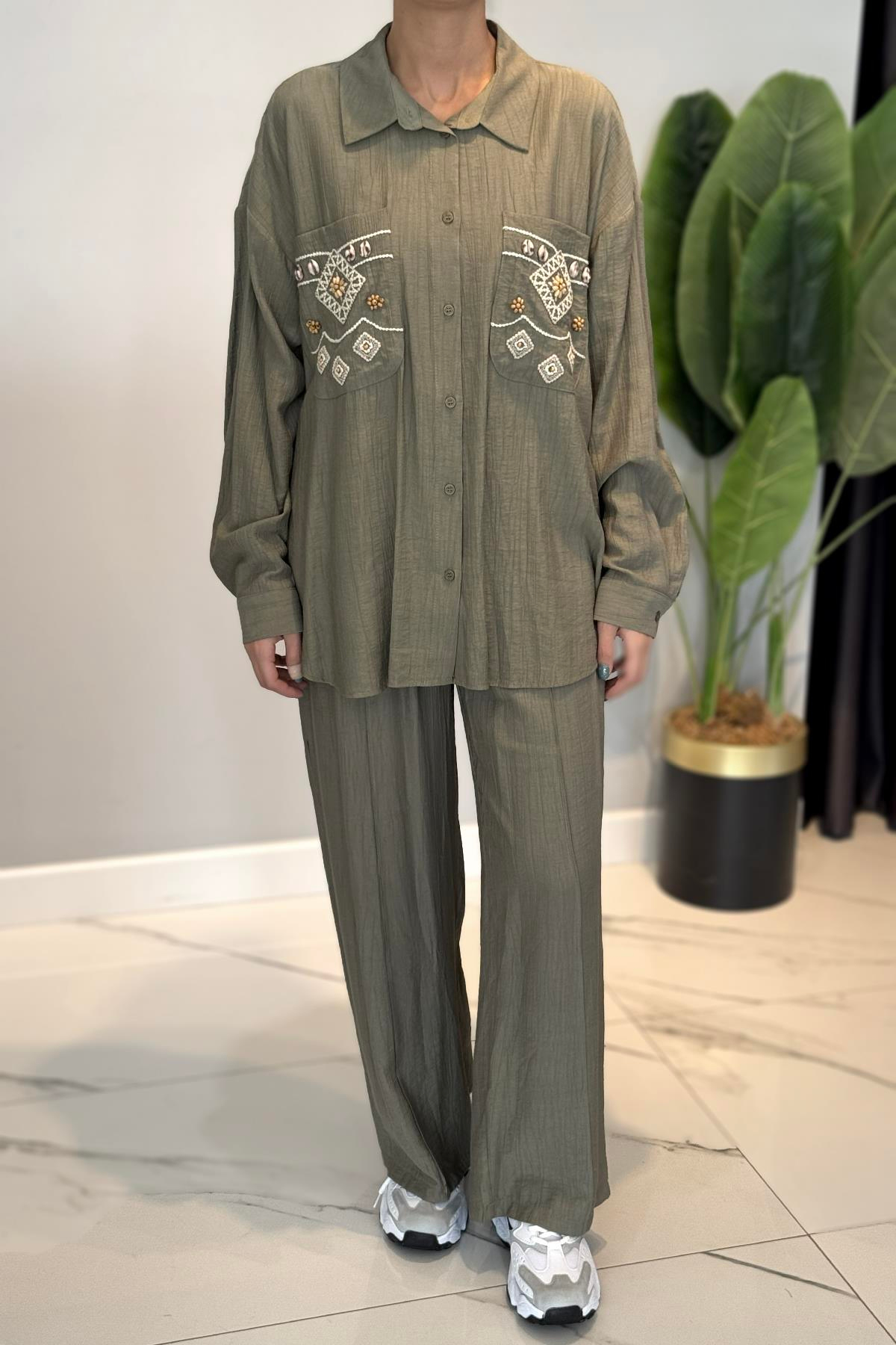 Nakış ve İşleme Detaylı Takım 34839 Haki Tunik ve pantolon olmak üzere 2 parça şeklinde takımdır. Kumaş Bilgisi: %89 viskon %11 poliamid Hem spor hem şık kombinlerinizde kullanabileceğiniz bir modeldir. Manken üzerindeki beden M bedendir. Manken boy:170cm Kilo:60 Bedenler:S-M-L şeklindedir. Kullanım sırasında, çanta, aksesuar veya takılara dikkat edilmelidir. Hassas üründür. YIKAMA TALİMATLARI: -Ilık suda ters çevrilerek yıkanmalıdır. -Tek başına yıkanmalıdır. -Renk verebilir. Kaloriferde vb. direk güneşte kurutmayınız.
