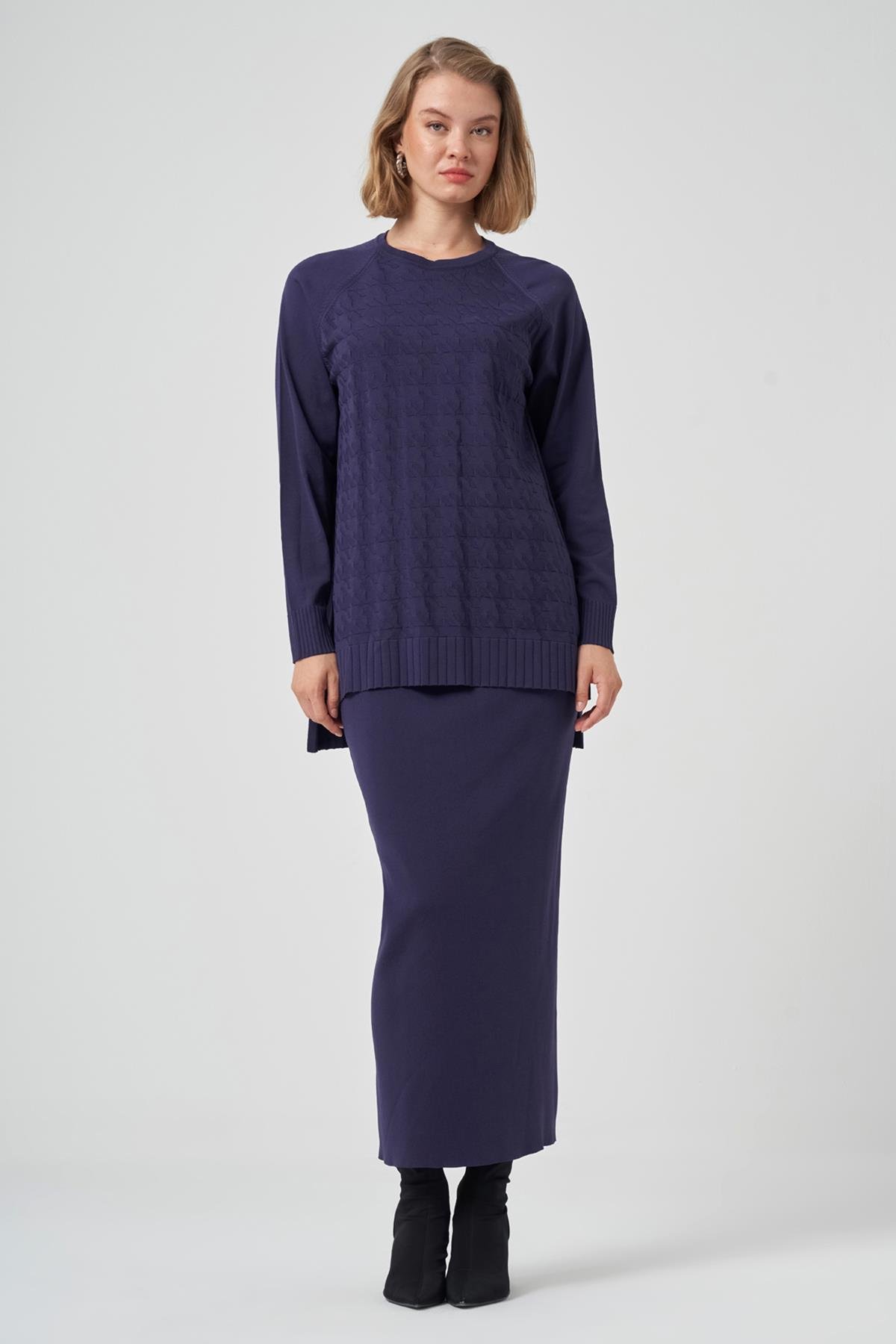 Nuss Kazayağı Desen Merserize Kalem Etekli Triko Takım 1350 Lacivert Tunik üst ve kalem etek olmak üzere 2 parça şeklinde takımdır. Merserize kumaştır. Hem şık hem spor kombinleyebileceğiniz bir takımdır. Bedenler: 1-2 şeklindedir. 1 BEDEN 38/40 2 BEDEN 42/44 UYUMLUDUR. Üst Tunik Boy:75cm Kalem Etek Boy:95cm Kullanım sırasında, çanta, aksesuar veya takılara dikkat edilmelidir. Hassas üründür. Kumaş İçeriği: YIKAMA TALİMATLARI: -Ilık suda ters çevirilerek yıkanmalıdır. -Tek başına yıkanmalıdır. -Renk verebilir. Kaloriferde vb. direk güneşte kurutmayınız.