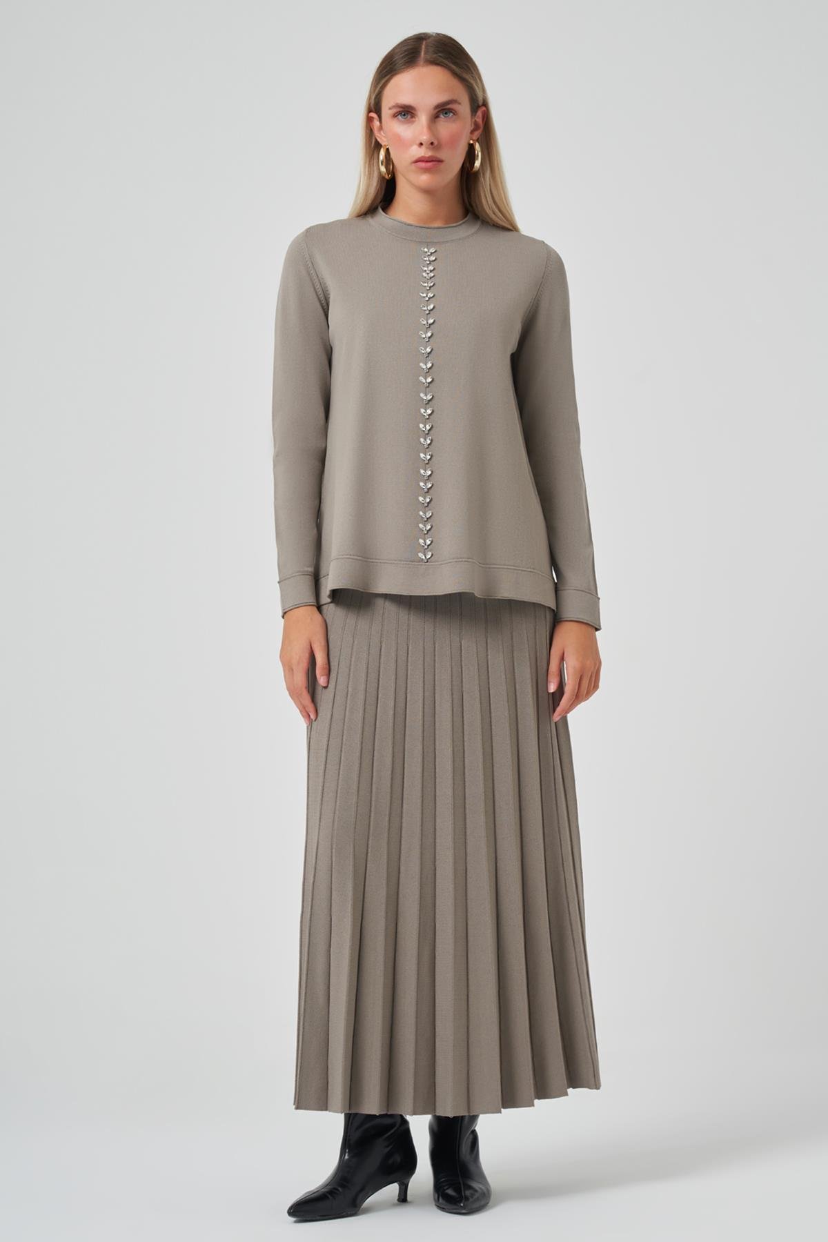 Nuss Taş İşleme Detay Triko Takım 1351 Açık Haki Hem şık hem spor kombinleyebileceğiniz bir takımdır. Tunik ve etek olmak üzere 2 parçadır. Tuniğin ön kısmında taş işleme detayı yer almaktadır. Bedenler: 1-2 şeklindedir. 1 BEDEN 38/40 2 BEDEN 42/44 UYUMLUDUR. Kullanım sırasında, çanta, aksesuar veya takılara dikkat edilmelidir. Hassas üründür. Kumaş İçeriği: YIKAMA TALİMATLARI: -Ilık suda ters çevirilerek yıkanmalıdır. -Tek başına yıkanmalıdır. -Renk verebilir. Kaloriferde vb. direk güneşte kurutmayınız.