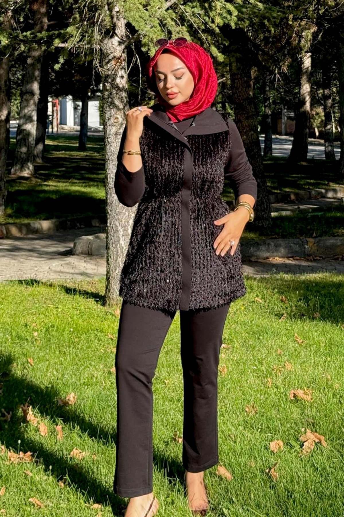 Payet Yelekli 3lü Takım 25102 Siyah Yelek, pantolon ve tunik olmak üzere 3 parça şeklinde takımdır. Hem şık hem spor kombinleyebileceğiniz bir ürün. Manken üzerindeki beden: 38 Beden Manken Ölçüleri: Boy:175cm Kilo:60 YIKAMA TALİMATLARI: -Ilık suda ters çevirilerek yıkanmalıdır. -Tek başına yıkanmalıdır. -Renk verebilir. Kaloriferde vb. direk güneşte kurutmayınız.
