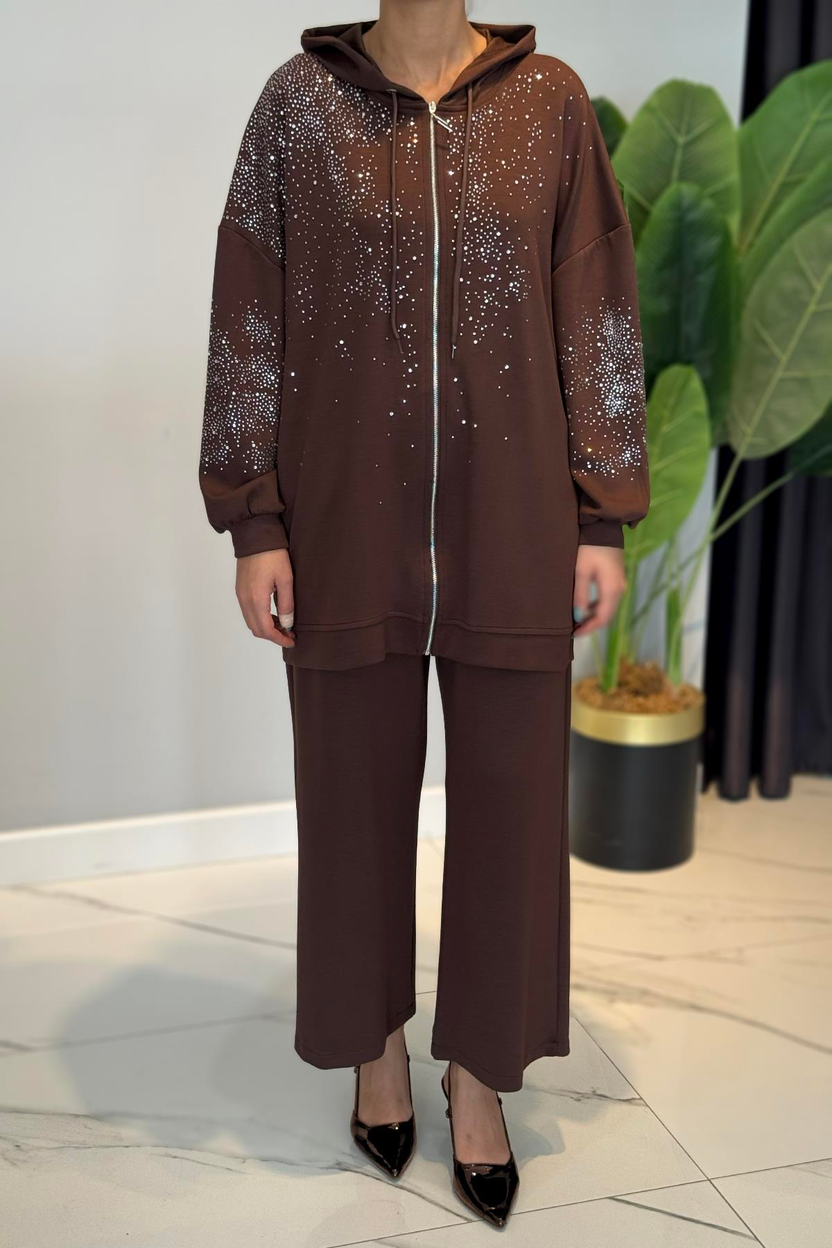 Taş Detay Modal Takım 120270 Kahverengi Tunik ve pantolon olmak üzere 2 parça şeklinde takımdır. Hem spor hem şık kombinlerinizde kullanabileceğiniz bir modeldir. Kumaş Bilgisi: %50 pamuk %47 polyester %3 elastik Manken üzerindeki beden 40 bedendir. Manken Boy:170cm Kilo:60 Bedenler:36-38-40-42-44-46 şeklindedir. Kullanım sırasında, çanta, aksesuar veya takılara dikkat edilmelidir. Hassas üründür. YIKAMA TALİMATLARI: -Ilık suda ters çevrilerek yıkanmalıdır. -Tek başına yıkanmalıdır. -Renk verebilir. Kaloriferde vb. direk güneşte kurutmayınız.