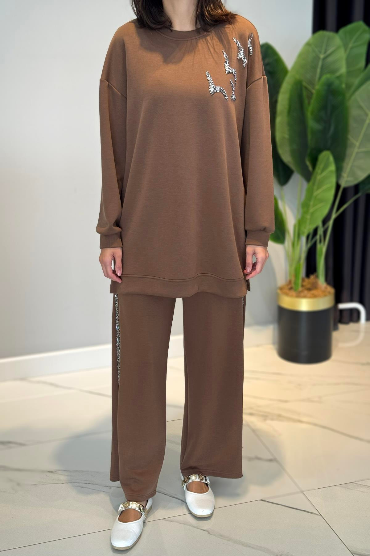 Taş Detaylı Modal Takım 120289 KahverengiTunik ve pantolon olmak üzere 2 parça şeklinde takımdır.Kumaş Bilgisi: %50pamuk %47polyester %3elastikHem spor hem şık kombinlerinizde kullanabileceğiniz bir modeldir.Bedenler: 36-38-40-42-44-46şeklindedir.Manken üzerindeki beden 38 bedendir.Manken boy:175cm Kilo:60Kullanım sırasında, çanta, aksesuar veya takılara dikkat edilmelidir. Hassas üründür. YIKAMA TALİMATLARI: -Ilık suda ters çevrilerek yıkanmalıdır. -Tek başına yıkanmalıdır. -Renk verebilir. Kaloriferde vb. direk güneşte kurutmayınız.