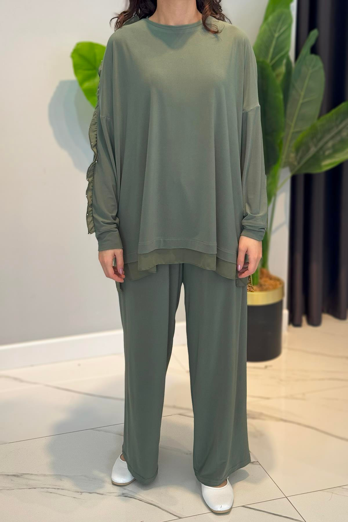 Tek Kolu Fırfır Şifon ve İnci Detaylı Sandy Pantolonlu Takım 59109 Haki Şifon detaylıdır. Kolunda boncuk detayları yer almaktadır. Pantolonu bol paçadır. Hem şık hem spor kombinleyebileceğiniz bir ürün. Bedenler: 1-2-3 şeklindedir. 1 Beden=Göğüs:136cm Bel:136cm Basen:140cm ÜstBoy: 75cm AltBoy:100cm civarıdır. 2 Beden=Göğüs:140cm Bel:140cm Basen:144cm ÜstBoy: 76cm AltBoy:101cm civarıdır. 3 Beden=Göğüs:144cm Bel:144cm Basen:148cm ÜstBoy: 77cm AltBoy:102cm civarıdır. Kumaş Bilgisi: %100pes Kullanım sırasında, çanta, aksesuar veya takılara dikkat edilmelidir. Hassas üründür. YIKAMA TALİMATLARI: -Ilık suda ters çevrilerek yıkanmalıdır. -Tek başına yıkanmalıdır. -Renk verebilir. Kaloriferde vb. direk güneşte kurutmayınız.