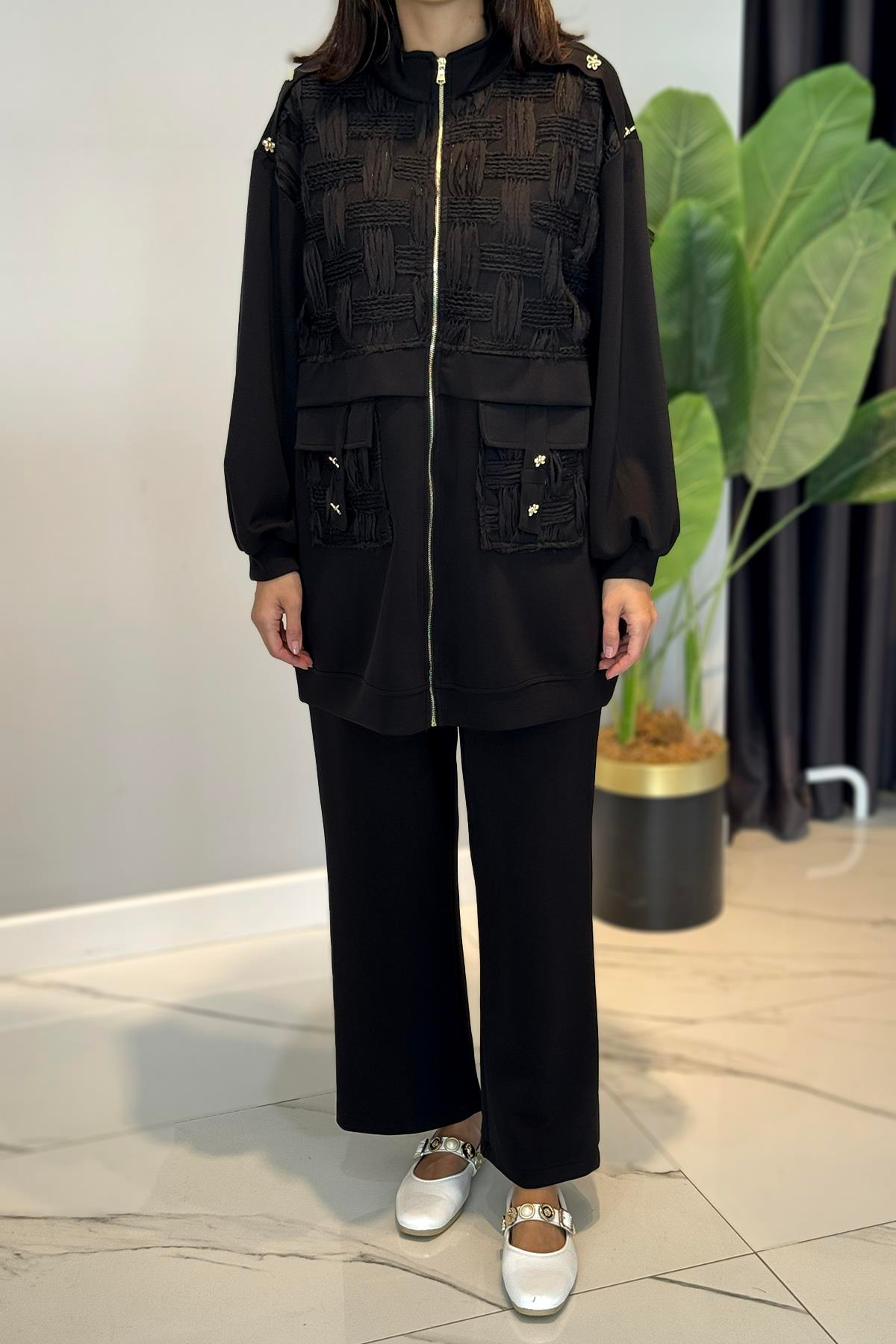 Tül Kapak Detaylı Fermuarlı Modal Takım 120278 Siyah Tunik ve pantolon olmak üzere 2 parça şeklinde takımdır. Kumaş Bilgisi: %50pamuk %47polyester %3elastik Hem spor hem şık kombinlerinizde kullanabileceğiniz bir modeldir. Manken üzerindeki beden 42 bedendir. Manken boy:170cm Kilo:60kg Bedenler: 36-38-40-42-44-46şeklindedir. Kullanım sırasında, çanta, aksesuar veya takılara dikkat edilmelidir. Hassas üründür. YIKAMA TALİMATLARI: -Ilık suda ters çevrilerek yıkanmalıdır. -Tek başına yıkanmalıdır. -Renk verebilir. Kaloriferde vb. direk güneşte kurutmayınız.