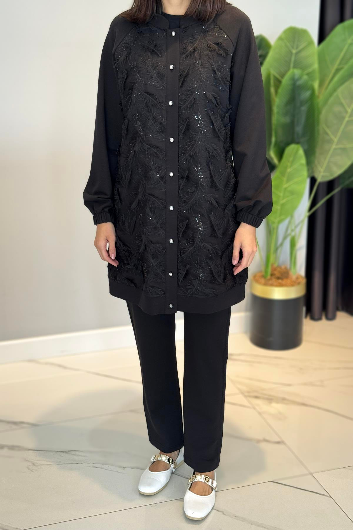 Tüy Detaylı 3lü Takım 18823 Siyah Yelek, pantolon ve tunik olmak üzere 3 parça şeklinde takımdır. Hem şık hem spor kombinleyebileceğiniz bir ürün. Manken üzerindeki beden: 38 Beden Manken Ölçüleri: Boy:175cm Kilo:60 YIKAMA TALİMATLARI: -Ilık suda ters çevirilerek yıkanmalıdır. -Tek başına yıkanmalıdır. -Renk verebilir. Kaloriferde vb. direk güneşte kurutmayınız.